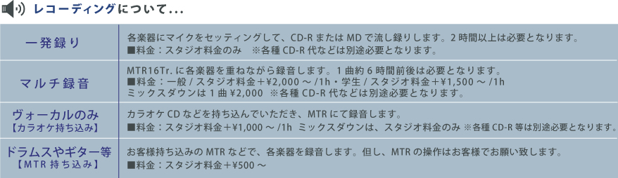 オーディション用レコーディング等、マルチ〜一発録音まで幅広く対応致します。