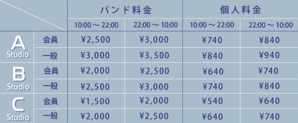 ※バンド料金:1時間1バンドの料金です。 ※個人料金:1時間1名の料金です。